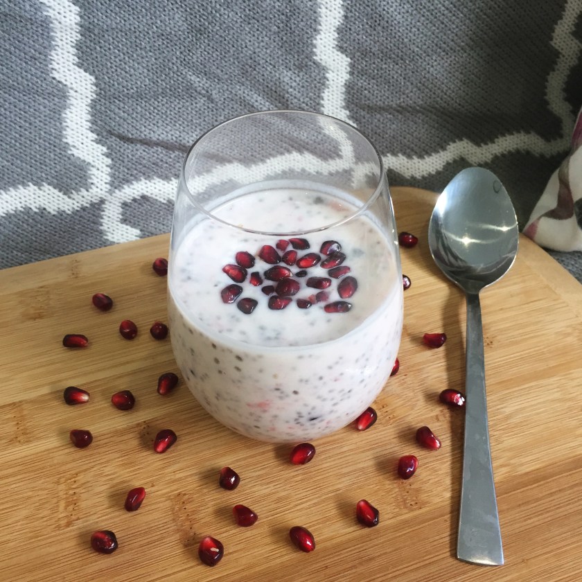 Serve in a cup or bowl and add more pomegranate seeds on top.